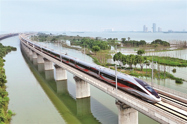 一列动车组列车经过沪宁沿江高铁江苏常州段。新华社发