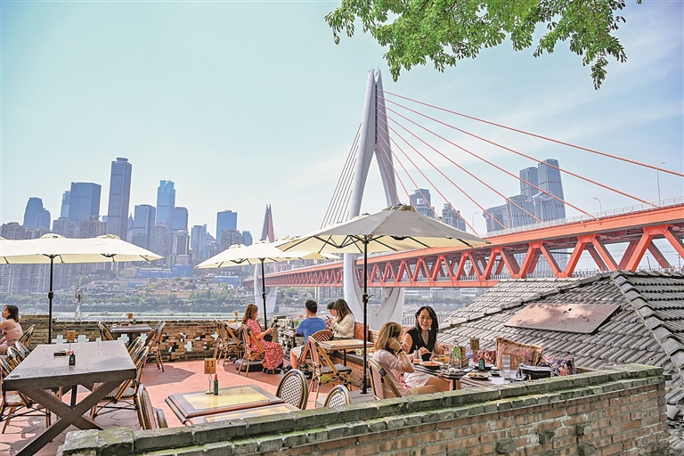 游客在重庆市南岸区龙门浩老街一家餐厅用餐。新华社发